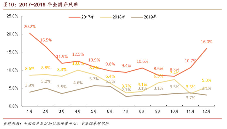 上一輪搶裝期過后,風(fēng)電場的并網(wǎng)需求遠(yuǎn)高于電網(wǎng)的消納能力,導(dǎo)致棄風(fēng)率在2016年達(dá)到高點。在風(fēng)電投資預(yù)警監(jiān)測機(jī)制的限制下,諸多已核準(zhǔn)項目陷入冷凍期。在經(jīng)歷了2015年15%、2016年17.1%的棄風(fēng)率高峰之后,棄風(fēng)率已連續(xù)三年實現(xiàn)下降,2019年實現(xiàn)棄風(fēng)率4%,同比降低3 pct,繼續(xù)保持即可滿足2020年棄風(fēng)率要求。